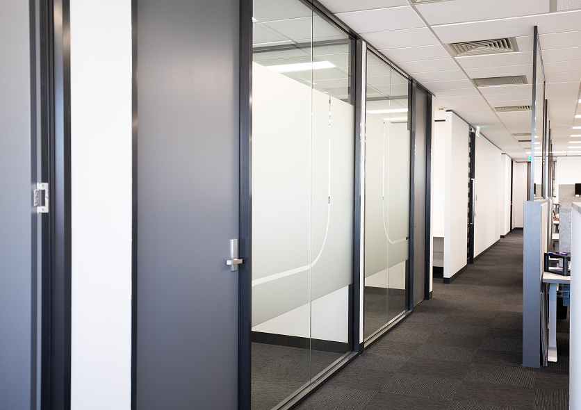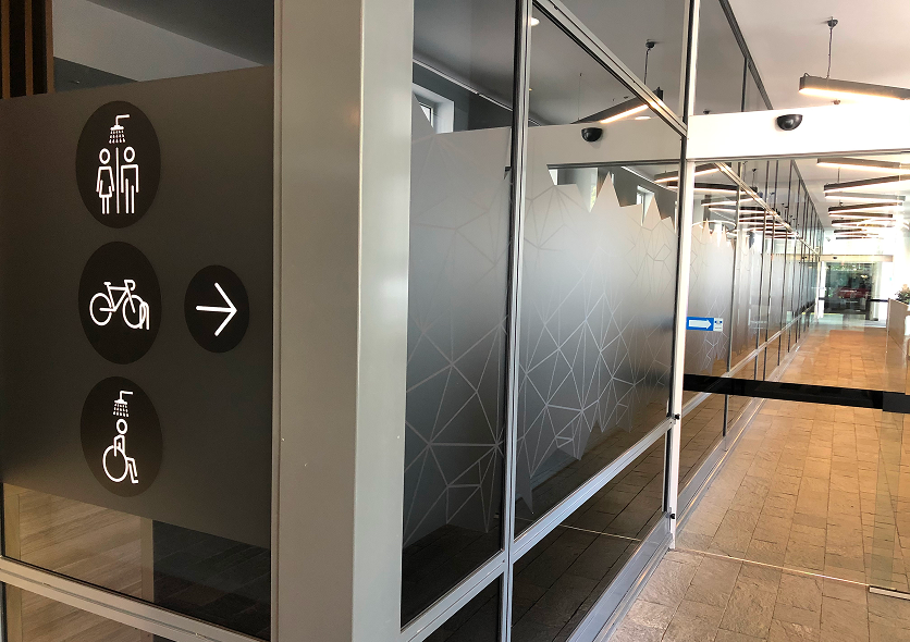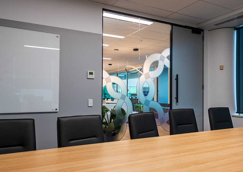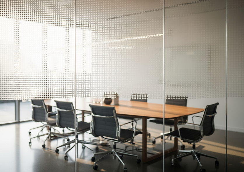Frosted or tinted finishes that create visual separation for meeting rooms, partitions and entryways while maintaining natural light.